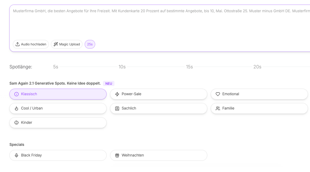 Entscheide selber: Magst du klassische Spots mit einem Gespräch zwischen zwei Menschen? Oder lieber etwas witziges? Von Emotional über Power Sale bis hin zu Sonderaktionen wie Weihnachten oder Black Friday: Sam Again hilft dir beim Texten und denkt auch mit! Unsere Ideen sind optimiert für beste Ergebnisse.