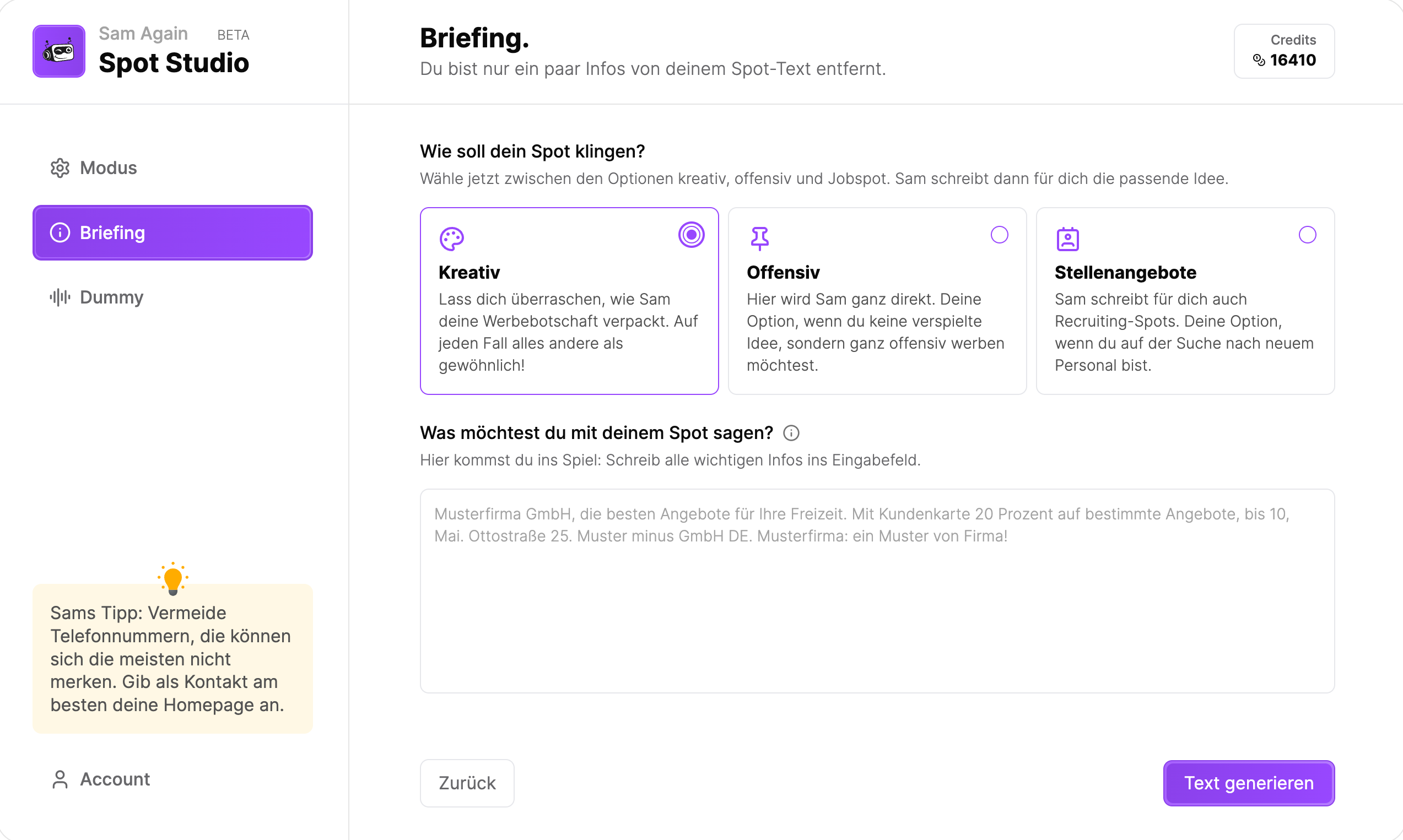 Aus deinem Briefing gestaltet Sam Again deine Ideen. Ob knallig, offensiv oder kreativ verspielt. Passe dann bei Bedarf die Texte, die Musik und sogar die Stimmen an, um deinen Wunschspot zu layouten. Danach ganz einfach vorhören und downloaden. Oder gönn dir ein Premium Hands on. Und dein Spot klingt wirklich fast wie ein Original.